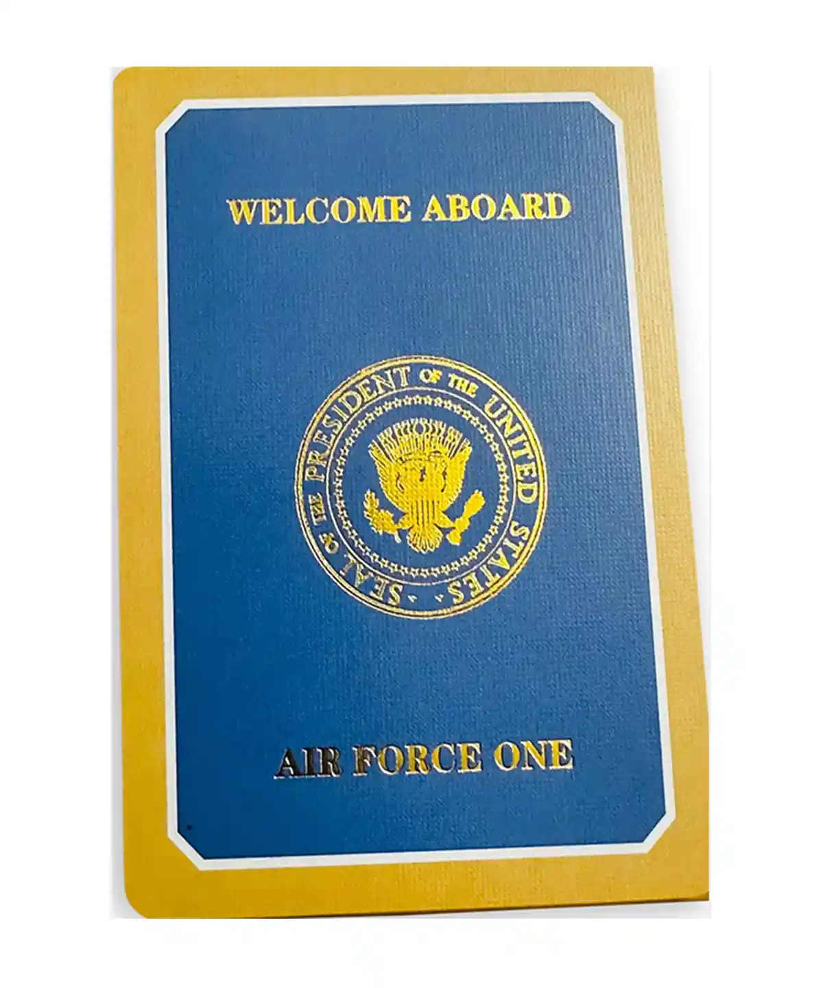 Take your card game to new heights with our Air Force One playing cards! Featuring the prestigious “Seal of the President” and the welcoming phrase “Welcome Aboard,” these cards add a touch of elegance to every hand. Decked out in striking gold and blue, they promise to make your next game truly memorable. Fly high with style and sophistication!