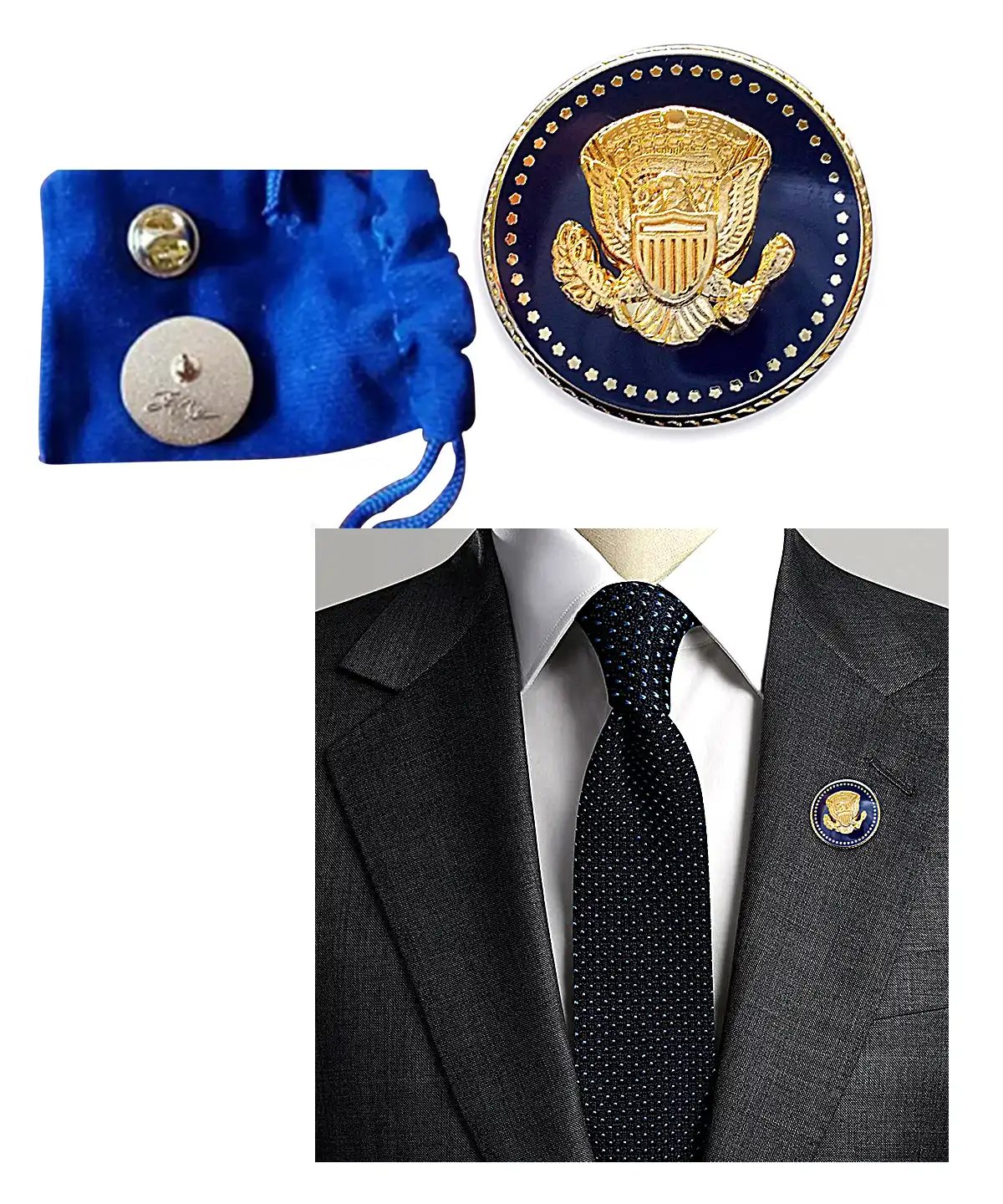 Elevate your style with these distinguished gold George W. Bush Presidential Seal Lapel Pins. Each pin features the iconic Presidential Seal Eagle, with President George W. Bush’s signature elegantly engraved on the reverse side.