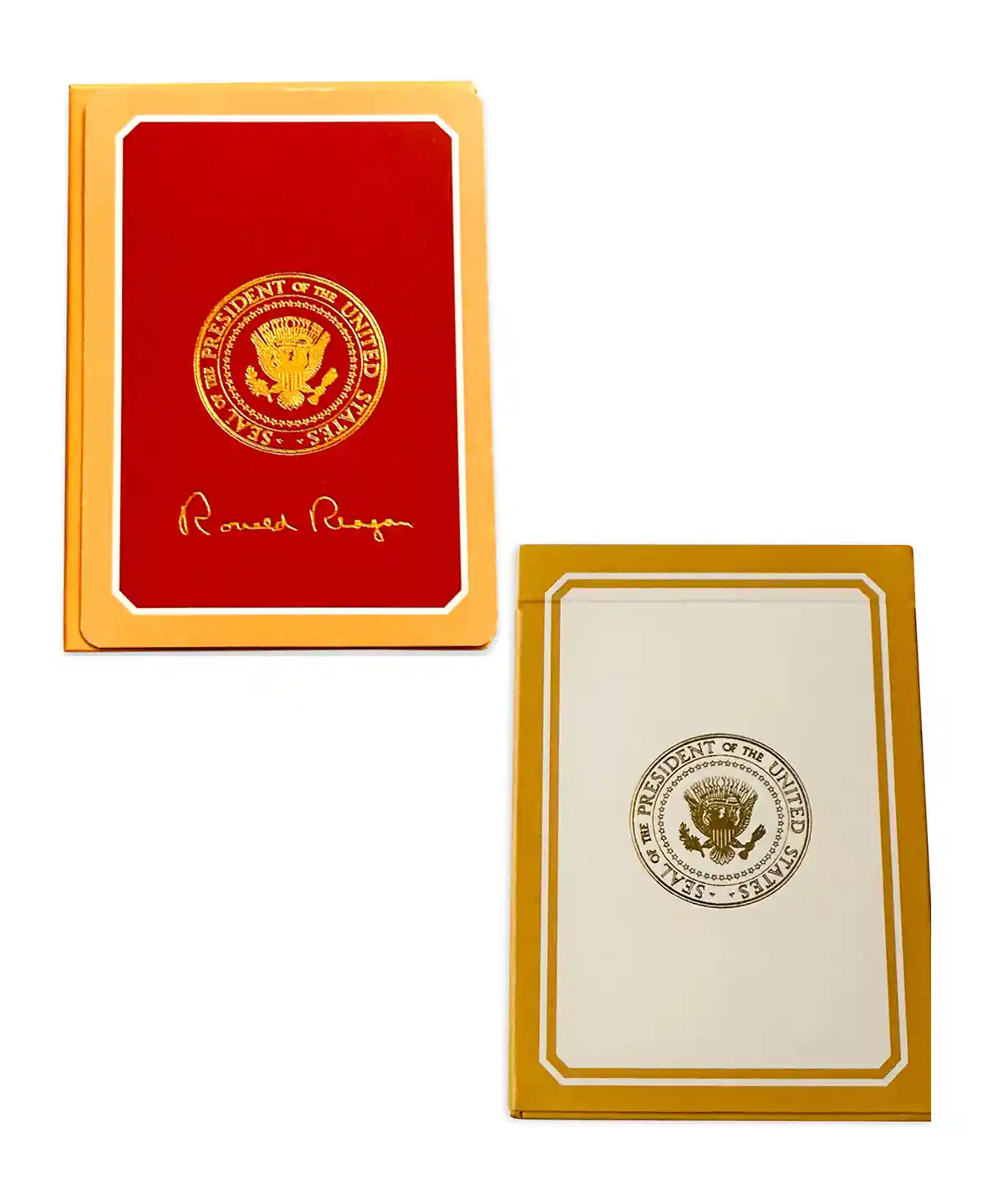 Make your next card game unforgettable with our exclusive Ronald Reagan playing cards! Featuring the distinguished “Seal of the President” and a striking gold and red design, these cards bring a touch of presidential elegance to every hand. Channel the charisma of the 40th President of the United States and add a touch of classic charm to your game night!