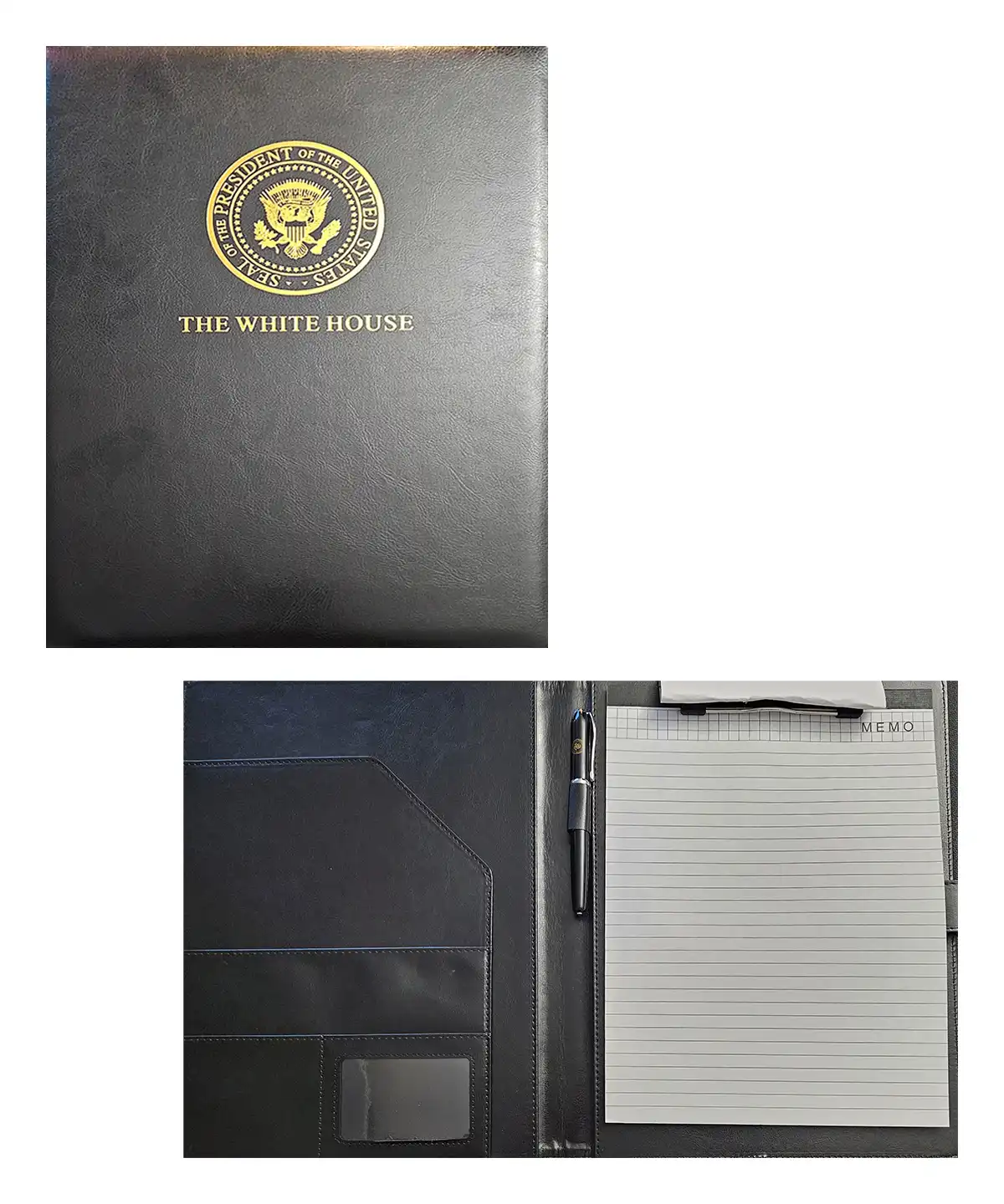 Exude professionalism with the White House Presidential Folder and Pen Set, a perfect combination of elegance and utility. The sleek black folder showcases the official Presidential Seal embossed in gold, along with “The White House” text, providing a sophisticated and authoritative look. The set also includes a premium pen, designed to complement the folder’s prestigious design.
